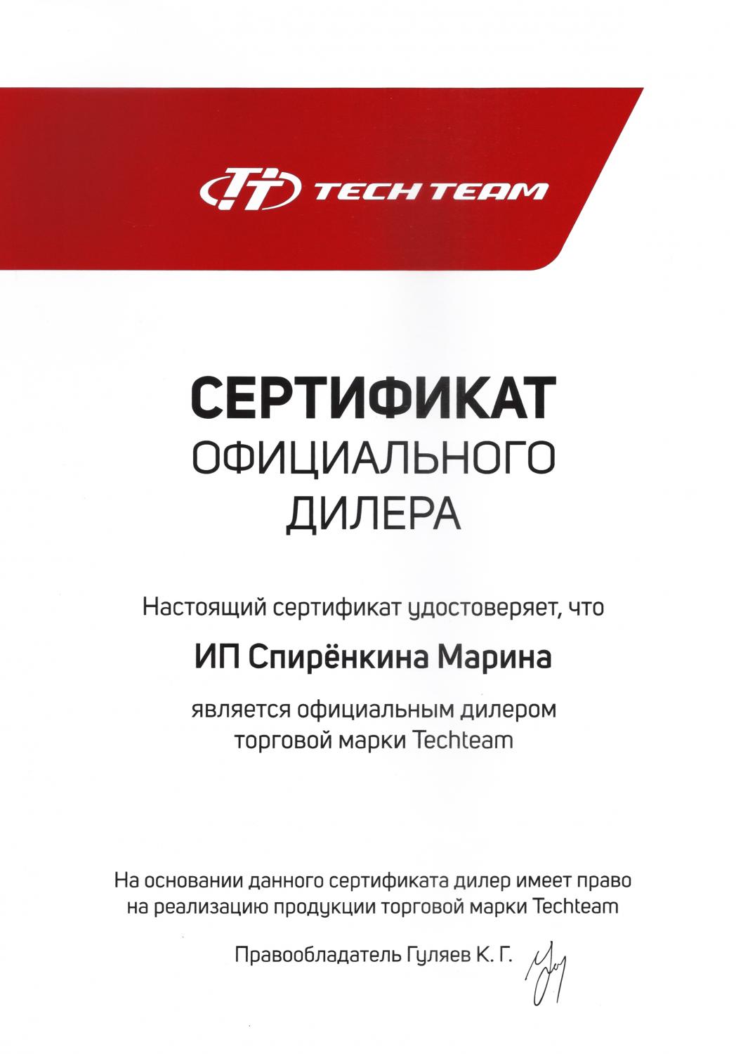 • Сертификат официального дилера "Tech Team" Сертификат официального дилера "Tech Team"