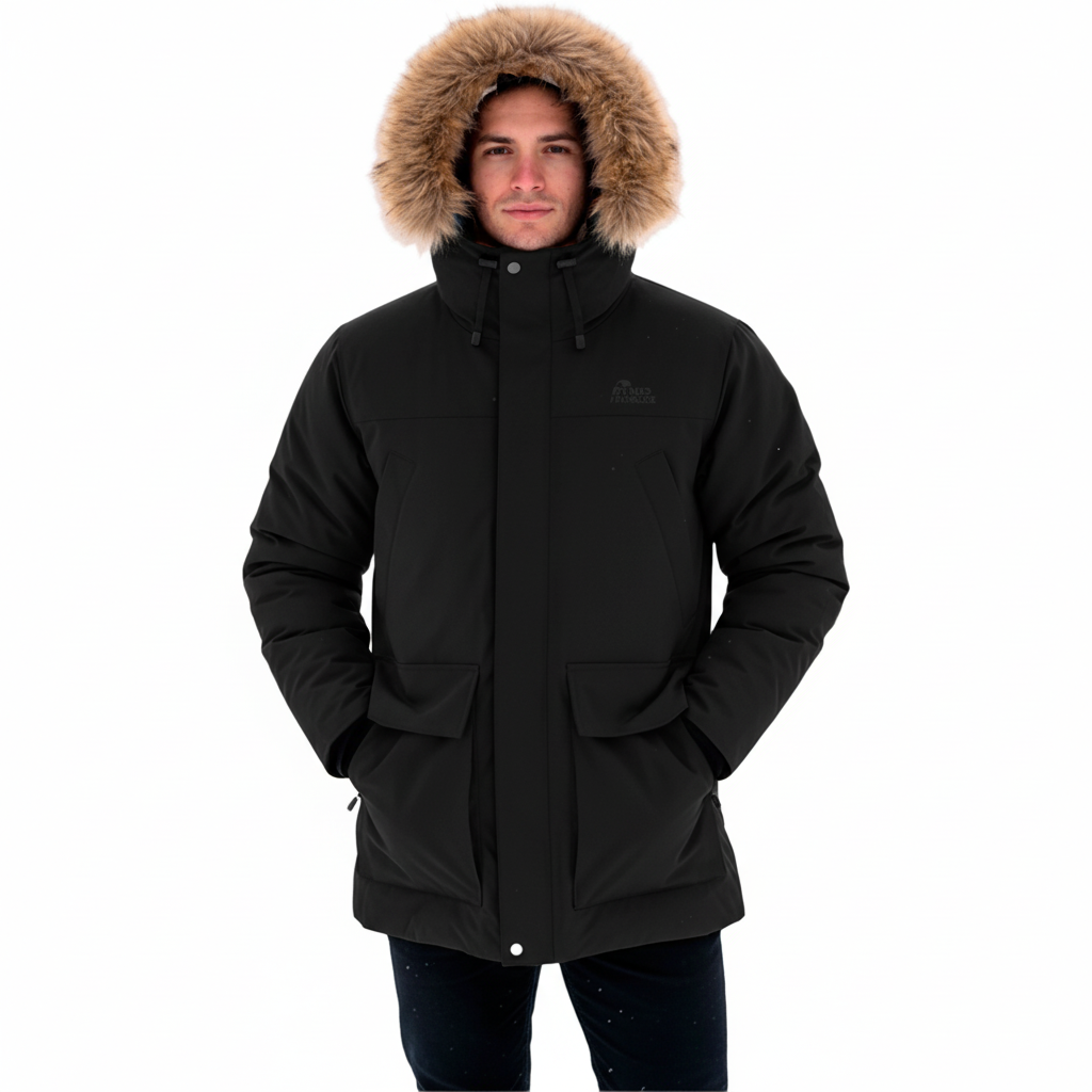 ДИКСОН – поселок городского типа, в котором находится самый северный порт России. Расположен на побережье Енисейского залива и на острове Диксон.Мужская пуховая куртка прямого свободного силуэта с внутренней регулировкой по талии, спинке и низу. Длина куртки до середины бедра. Удлиненная спинка хорошо удерживает тепло. Множество деталей дополнительного утепления создают комфортный микроклимат внутри пуховики. Анатомический крой в области плеч и рукавов позволяет свободное движение плечей и рук в стороны и вверх. Втачной капюшон-тубус регулируется по ширине и глубине, имеет отстегивающуюся опушку из меха енота. Модель предназначена для низких температур, сопровождающихся ветром и снегом.